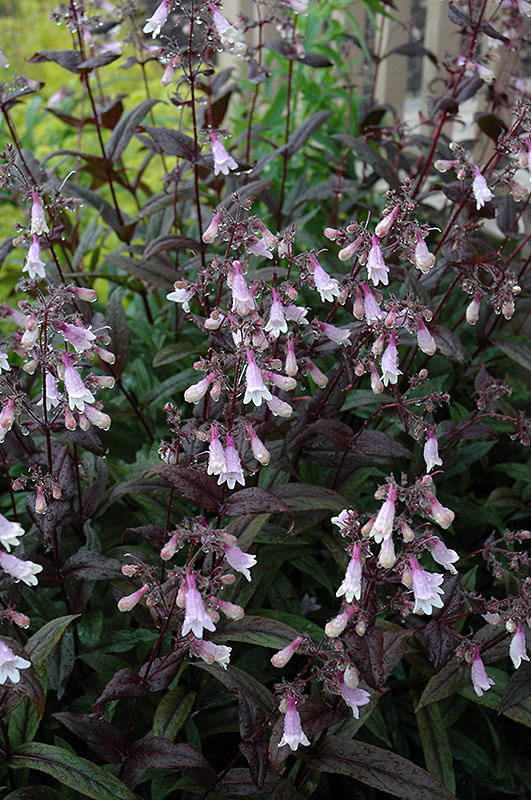 Dark Towers Beard Tongue has masses of beautiful spikes of white tubular flowers with a pink reverse rising above the foliage from early to mid summer, which emerge from distinctive violet flower buds, and which are most effective when planted in groupings. The flowers are excellent for cutting. Its attractive glossy narrow leaves emerge burgundy in spring, turning dark green in color with distinctive deep purple edges. The foliage often turns brown in fall. The deep purple stems are very colorful and add to the overall interest of the plant.