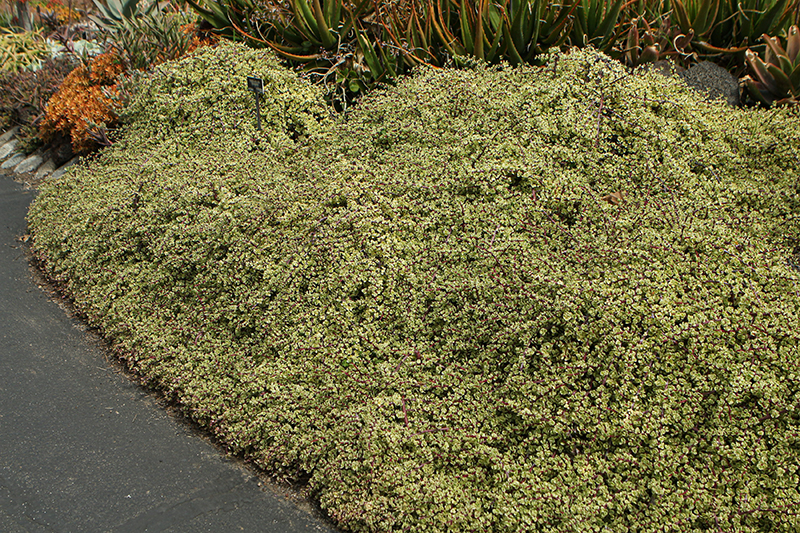 Variegated Elephant Food is primarily valued in the landscape or garden for its ornamental upright and spreading habit of growth. It features dainty lavender flowers at the ends of the branches in early summer. Its attractive small succulent round leaves remain green in color with showy creamy white variegation and tinges of pink throughout the season. The brick red stems are very colorful and add to the overall interest of the plant.