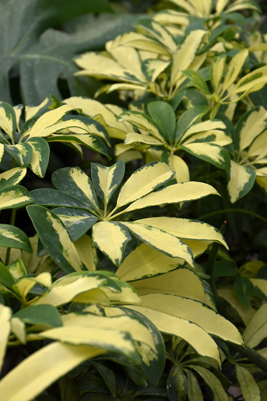 Trinette Variegated Schefflera's attractive glossy oval compound leaves remain dark green in color with showy yellow variegation and tinges of creamy white throughout the year on a plant with a round habit of growth.