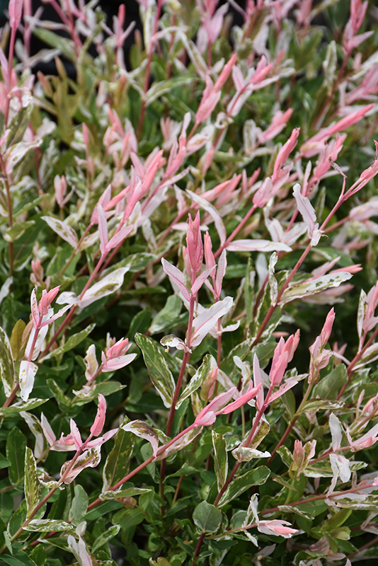 One of the showiest of shrubs for foliage color, new growth emerges soft pink and white, literally bathing the plant with color in spring, fades to white variegation in summer; should be pruned every winter for maximum effect; tough and adaptable